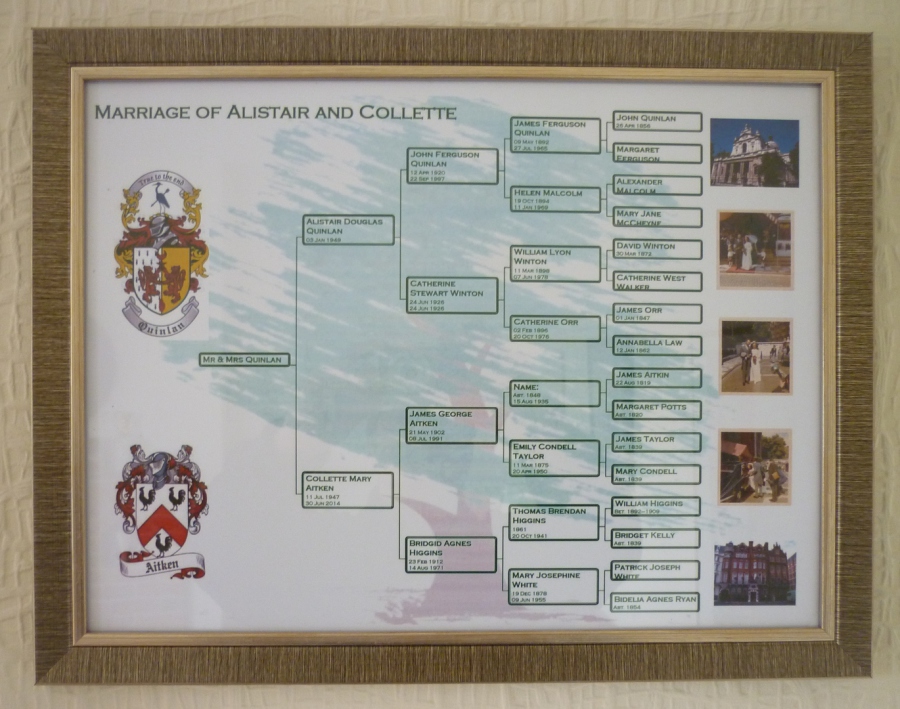Two families becoming one - an attractive framed ancestral chart displaying both your parents and grandparents. You can add photographs of your choice, and if they exist, perhaps a generic coat of arms.